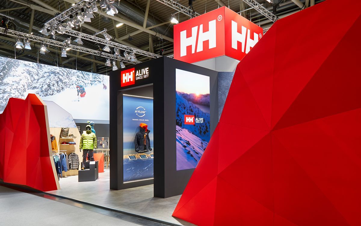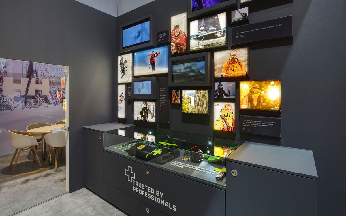 - Standstruktur in konventioneller Bauweise mit individuell gefertigten Standbauelementen wie Trennwände und Exponate, Stoffspannrahmen und LED video Elementen