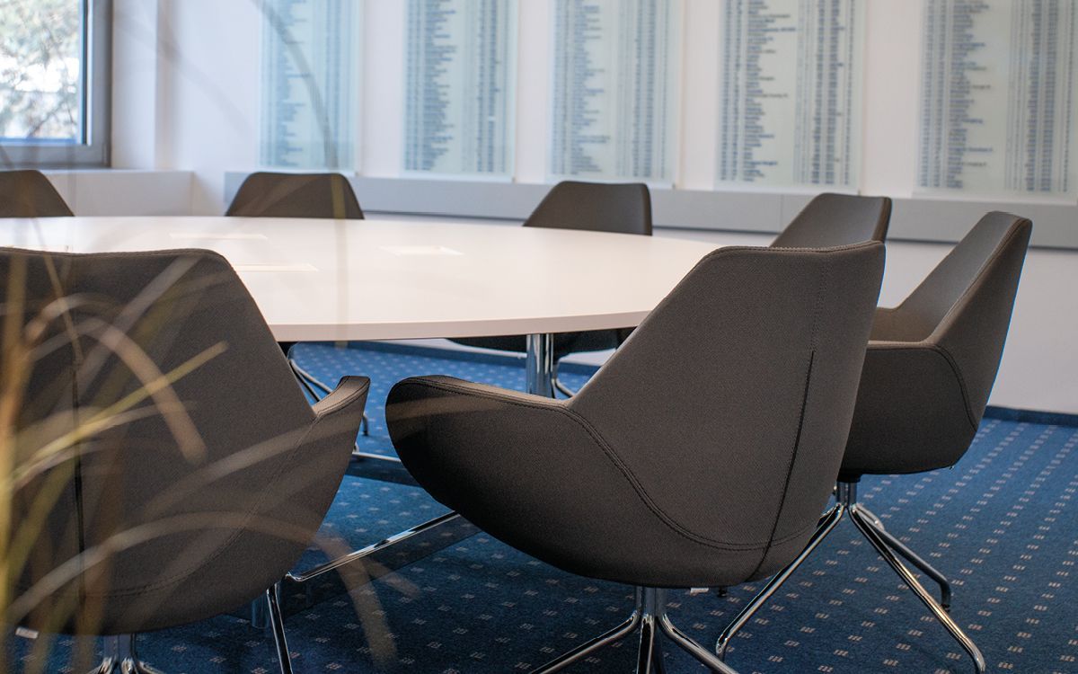 - Umgestaltung des Meetingraums mit großem runden Besprechungstisch, Sideboards, Beleuchtung und mobiler Referenz-Wand
