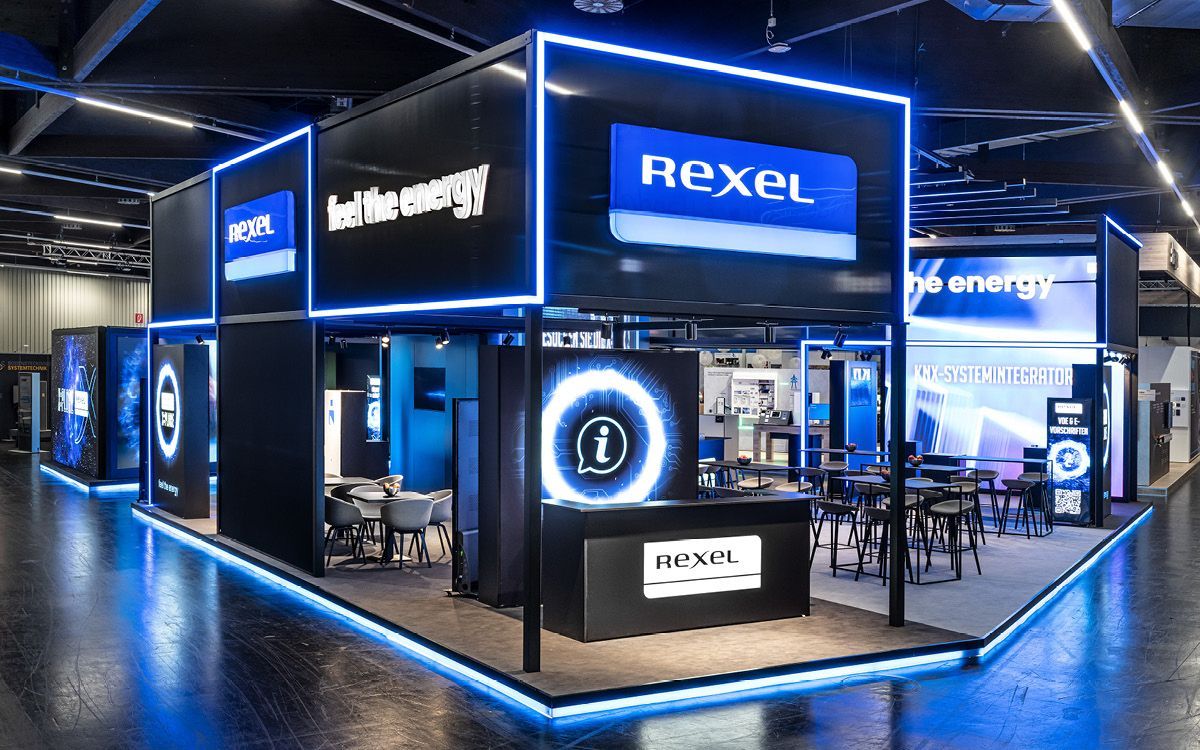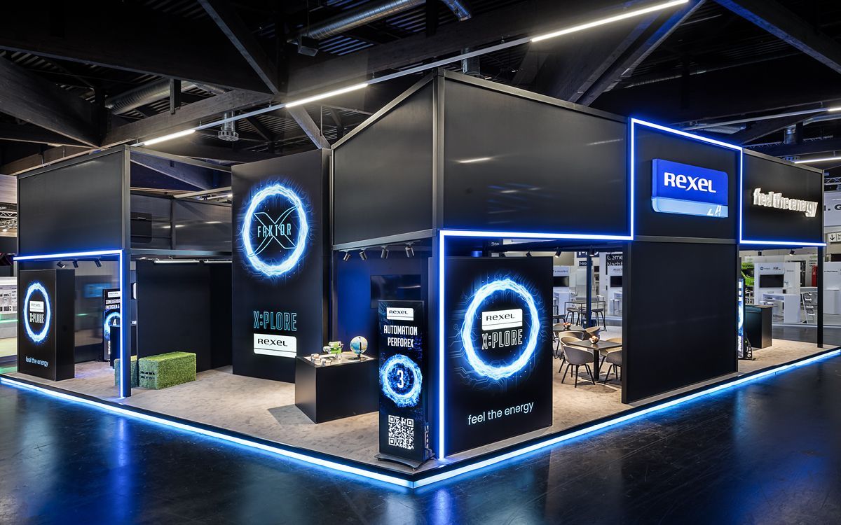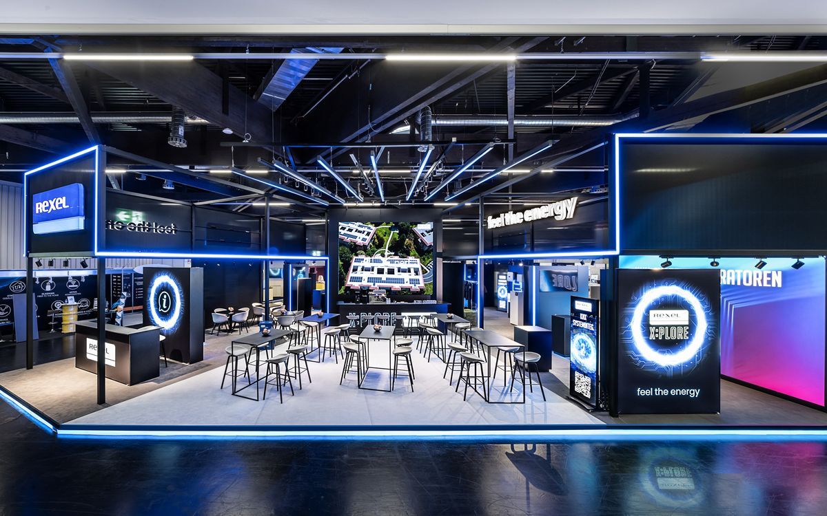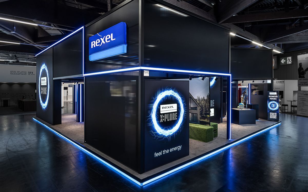 - Standstruktur bestehend aus Rahmenkonstruktion mit offenen und geschlossenen Flächen inkl. partiell hinterleuchteten Stoffgrafiken, LED video walls, Leuchtlogos und steuerbaren LED-stripes