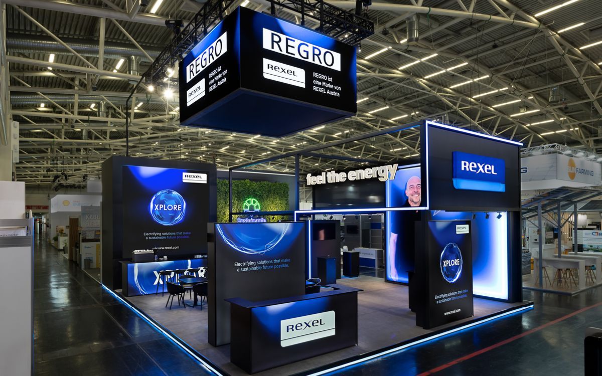 - Standstruktur bestehend aus Rahmenkonstruktion mit offenen und geschlossenen Flächen inkl. partiell hinterleuchteten Stoffgrafiken, LED video walls, Leuchtlogos und steuerbaren LED-stripes